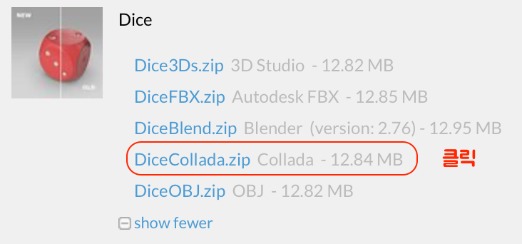 검색을 통하여 원하는 모델 검색 → Formats에서 확장자 .dae(Collada) 선택 -> 다운로드 시 Collada폴더만 다운로드하면 됩니다