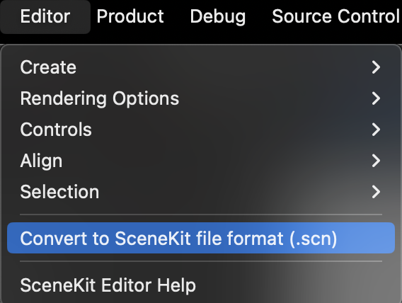 2. Xcode내부의 Editor -> convert(.scn)을 통하여 변환
