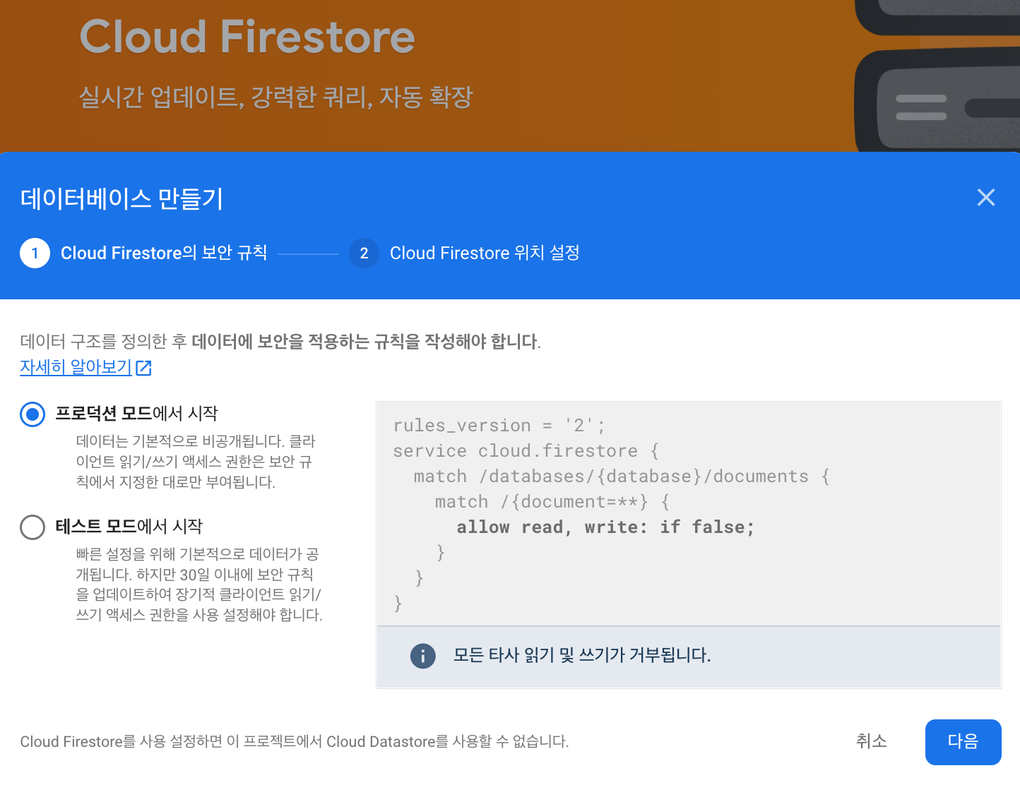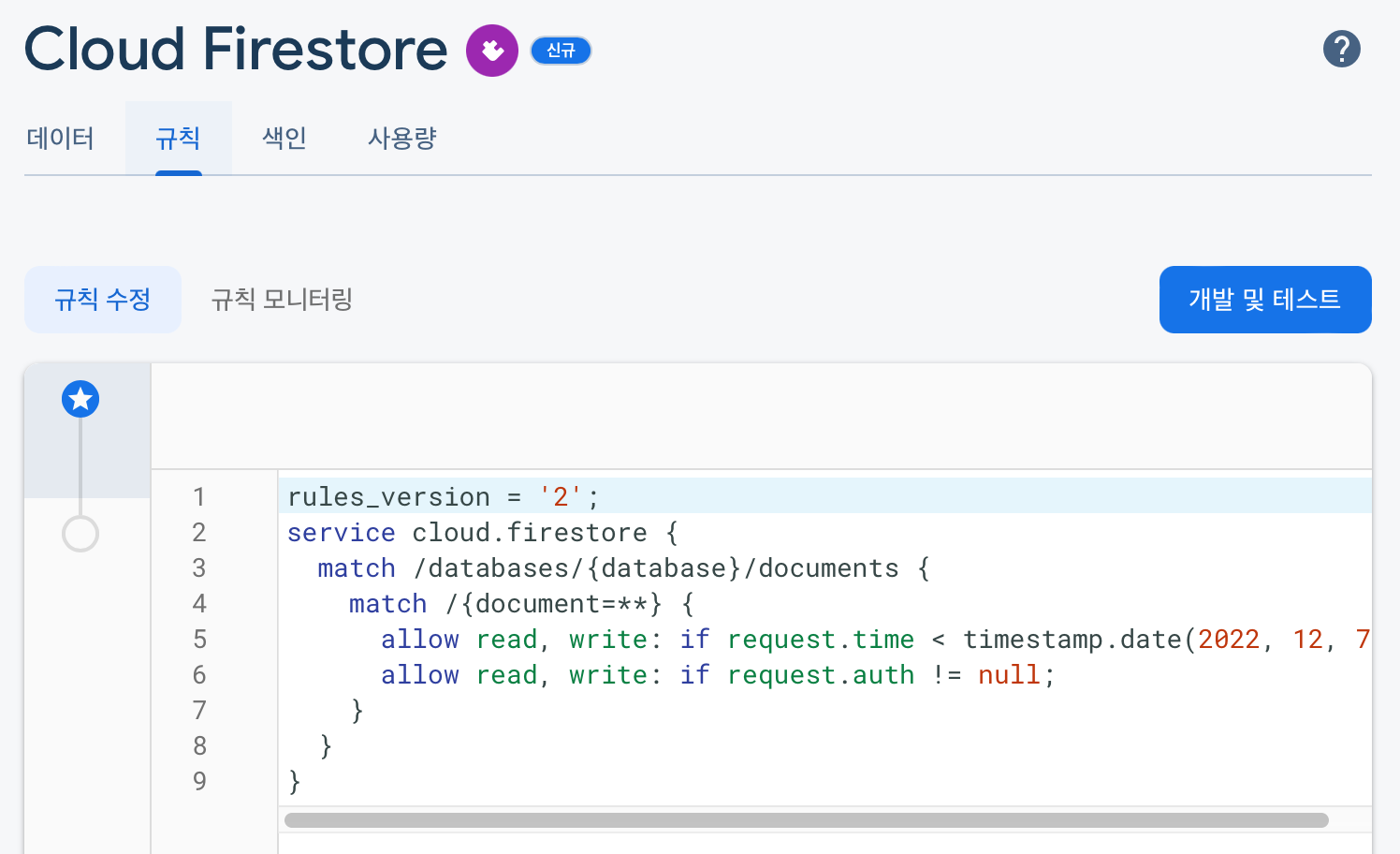 홈페이지에서 데이터베이스 만들기 데이터 읽기나 쓰기가 안된다면 아래 있는 규칙을 설정해줘야 합니다.